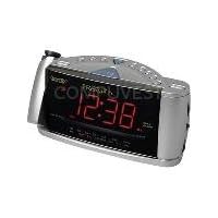 Dual Alarm Clock Radio - Emerson dual alarm clock radio- Dual alarm with independent variable programming- Projects time, month/date, year, or alarm time on wall or ceiling- Jumbo, easy to read 1.3" LED clock display- AM/FM radio- Choice of 3 alarm modes: everyday, weekdays only, weekends only- SmartSet built-in computer chip automatically accounts for all time changes for almost a century - Battery backup system (battery included)- Multiple time zone settings cover all 50 states- Sleep and snooze functions- 24 hour set and forget alarm with auto repeat and auto shutoff- Push button month/date and year display- Wide range dynamic speaker- Box dimensions: 9.75"L x 5.25"W x 4.5"D- SilverEMCKS3516